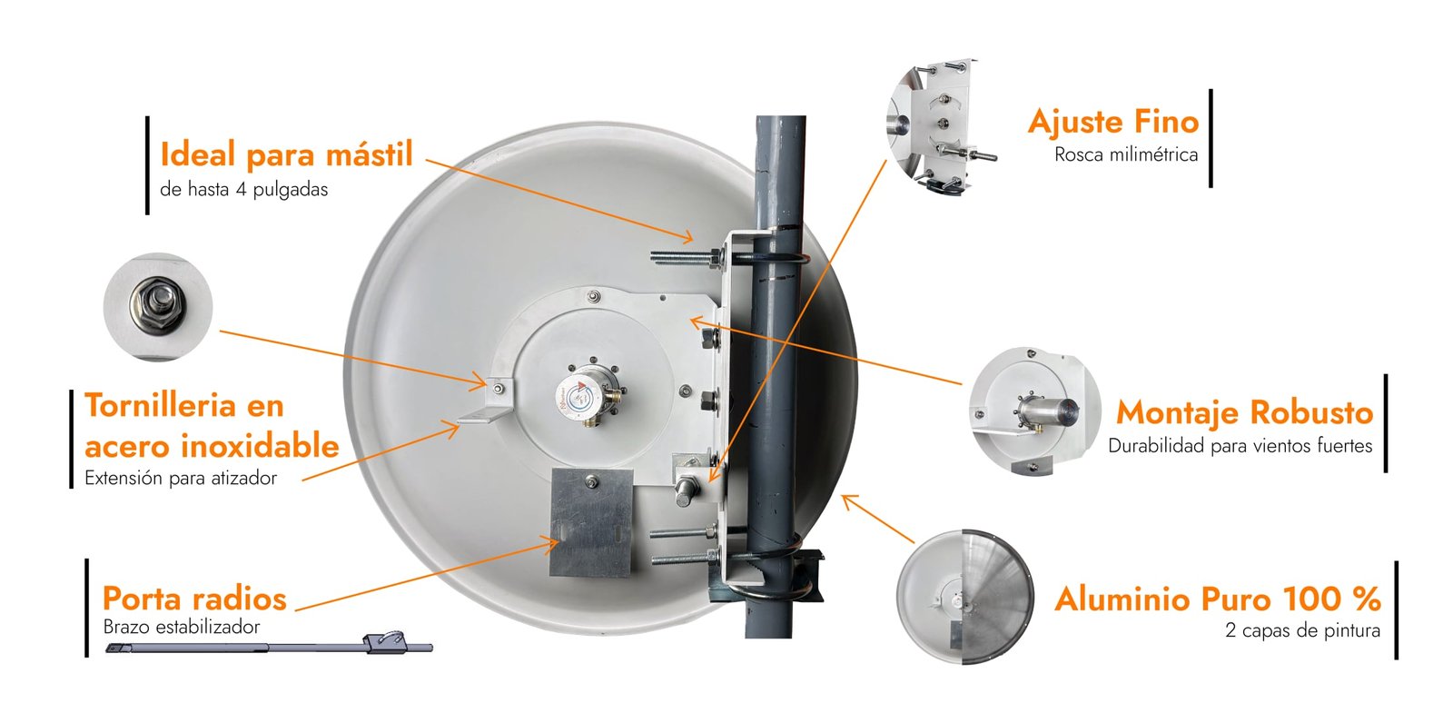 La antena NP6 es una antena parabólica para enlaces backhaul de punto a punto para distancias optimas de 1 hasta 50 km. Es una antena conectorizada de tipo N a N incluye jumpers N- SMA y radomo compatibles con las marcas Ubiquiti, Cambium Networks y mimosa Networks tiene una ganancia de 32 dbi y una frecuencia de operación de 5.9 a 7.2 GHz.